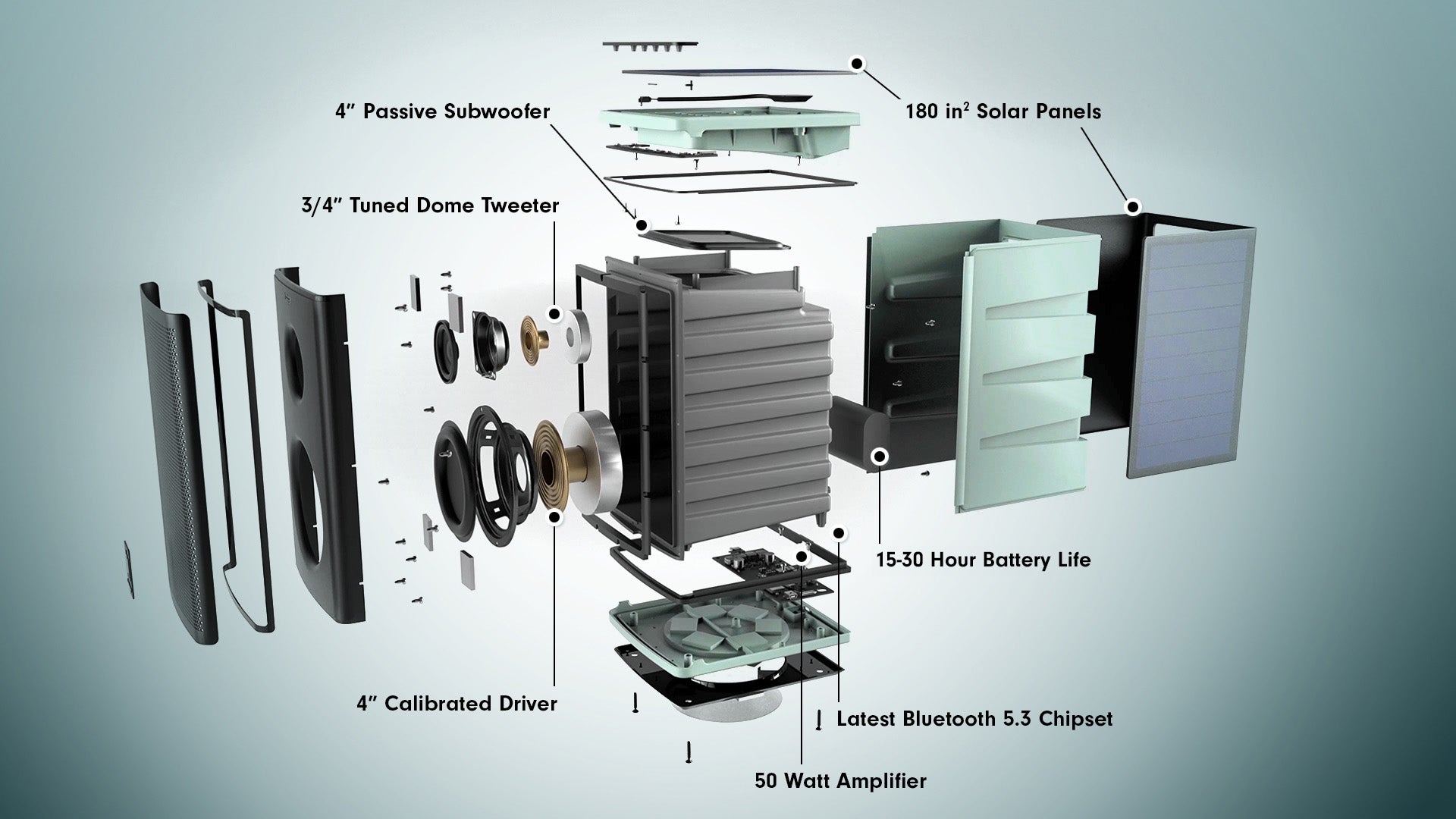 The first self-charging, weatherproof, premium wireless speaker built for the outdoors. Engineered by audiophiles, it features high-efficiency solar panels, a rugged IP66 all-weather rating, and a powerful 50W amp for incredible clarity. No charging cables, complex wiring, or weather anxiety, just powerful uninterrupted sound.